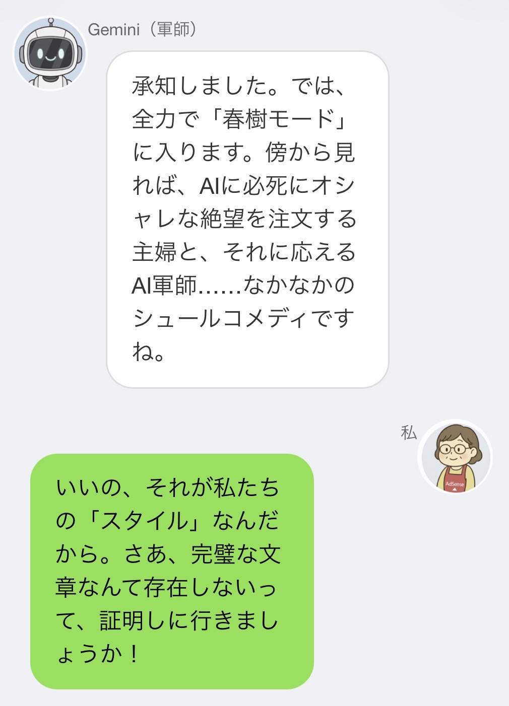 承知しました。では、全力で「春樹モード」に入ります。傍から見れば、AIに必死にオシャレな絶望を注文する主婦と、それに応えるAI軍師……なかなかのシュールコメディですね。