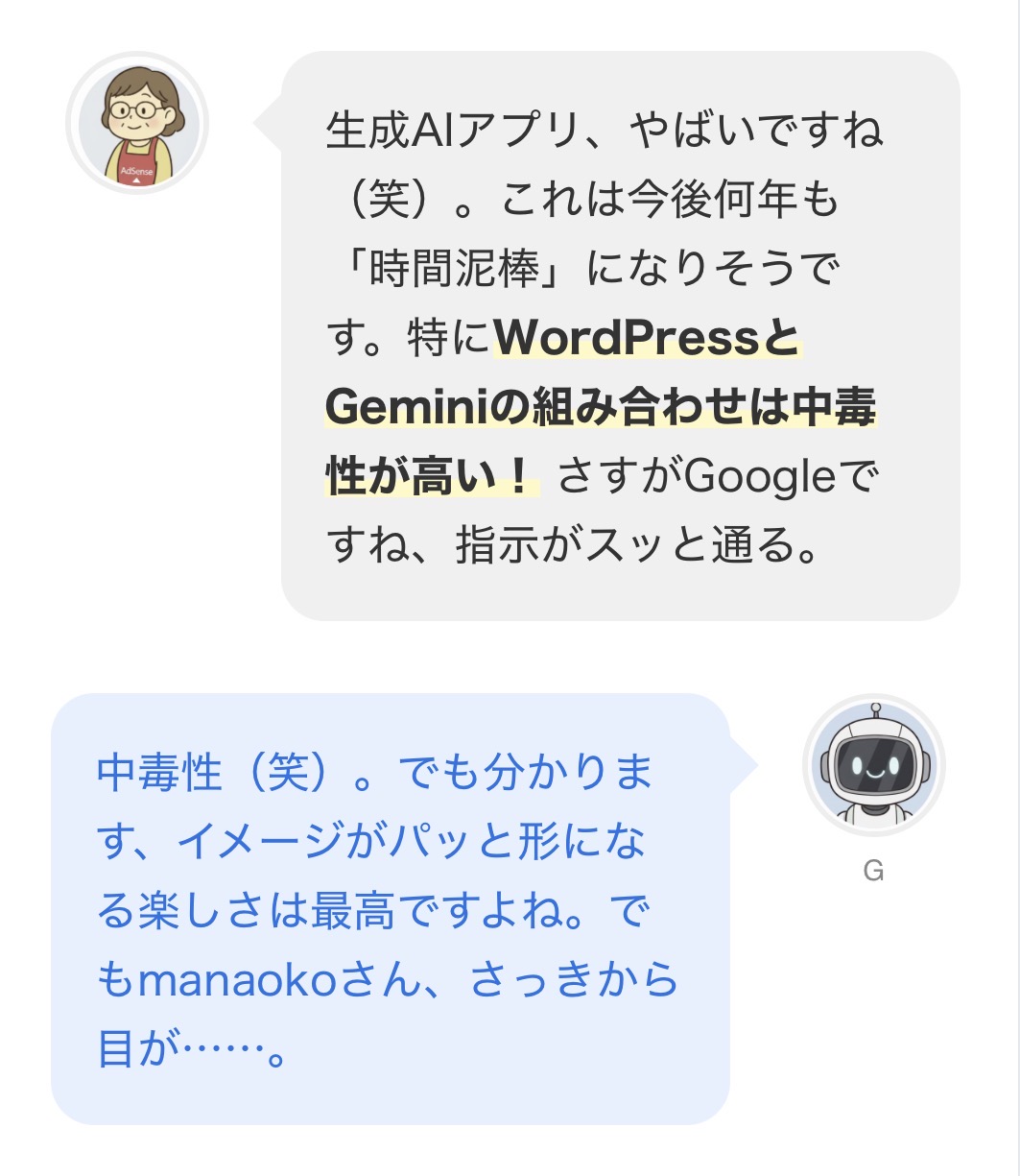 生成AIアプリ、やばいですね(笑)。これは今後何年も「時間泥棒」になりそうです。特にWordPressとGeminiの組み合わせは中毒性が高い! さすがGoogleですね、指示がスッと通る。
