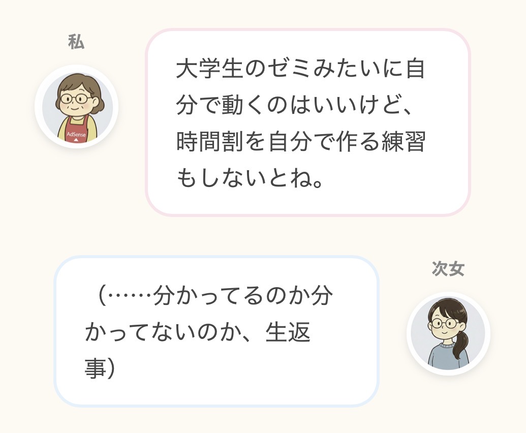 大学生のゼミみたいに自分で動くのはいいけど、時間割を自分で作る練習もしないとね。
