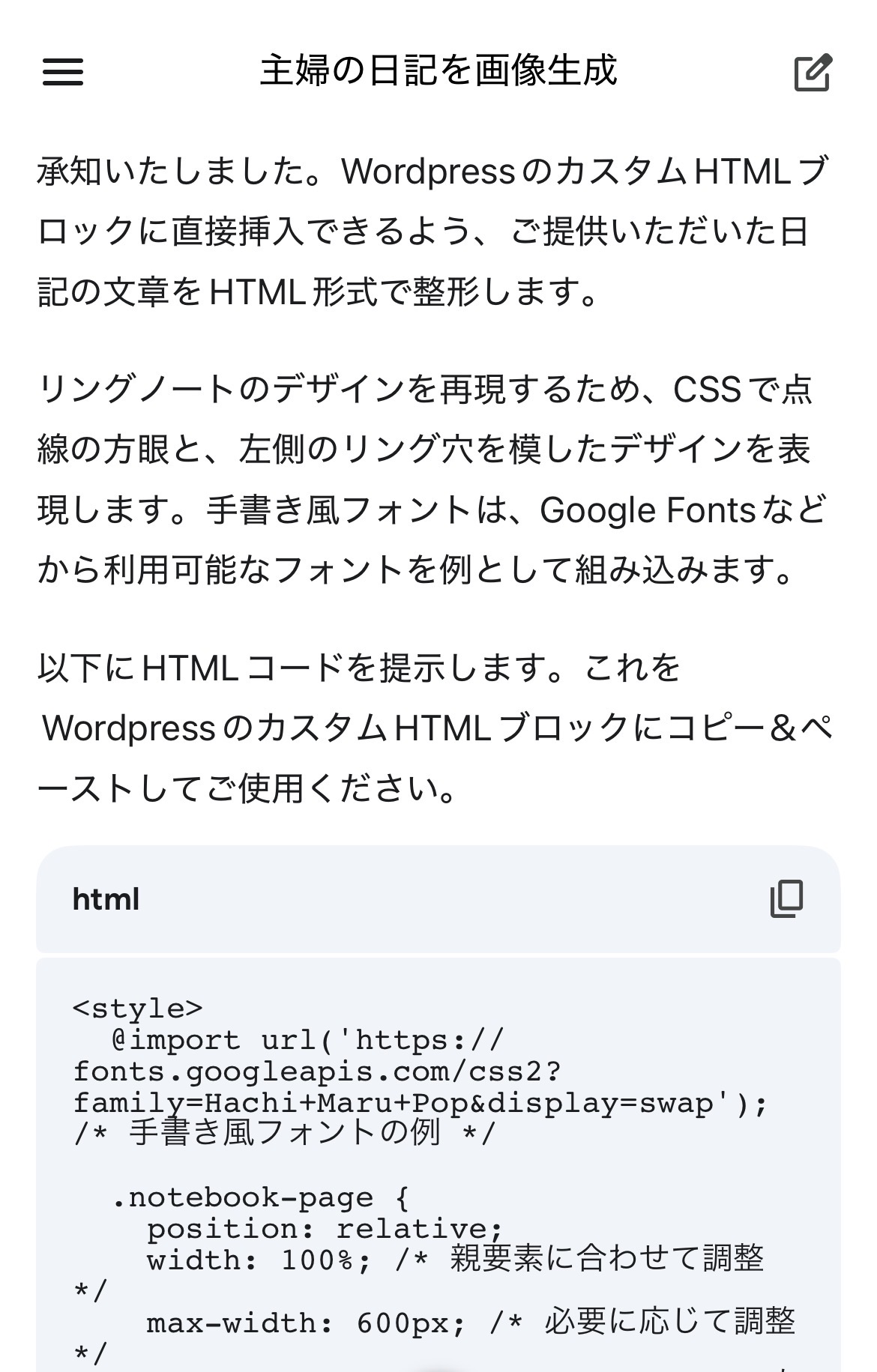 これで、Geminiが背景デザインと手書き風文字をセットにした「専用コード」を生成してくれます!